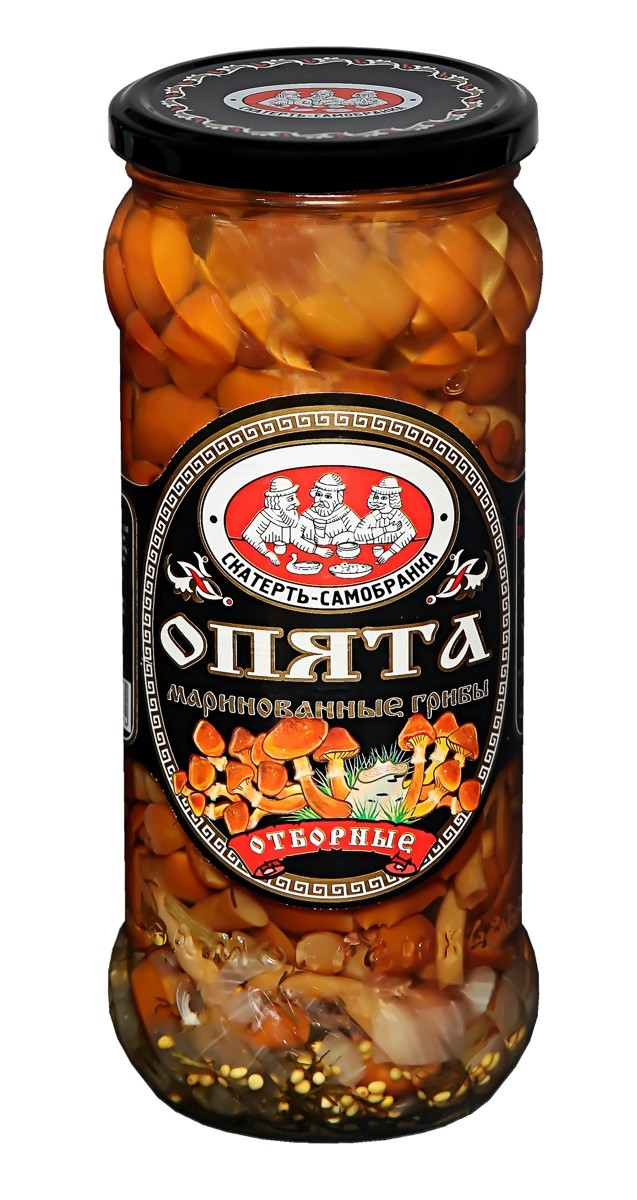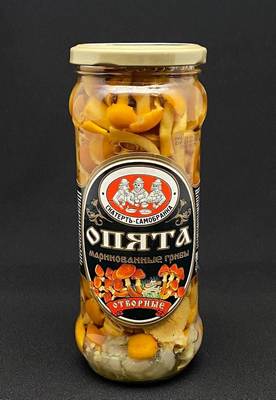 Состав: опята, вода, сахар, соль, уксусная кислота, зелень укропа, семена горчицы, лук, чеснок и др. пряности и специи